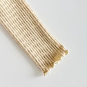 Soft ribbed cropped cardigan in a creamy neutral shade with delicate ruffle trim along the neckline and button front.