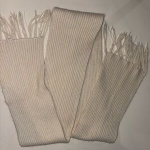 Cozy cream ribbed knit scarf with fringe ends. Perfect for chilly days.