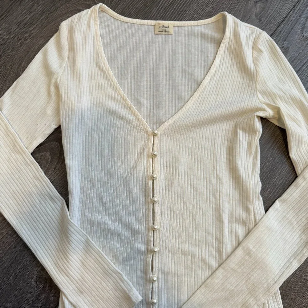 This top is ADORABLE! A ribbed cardigan style fitted top with pearl button details all along the front.