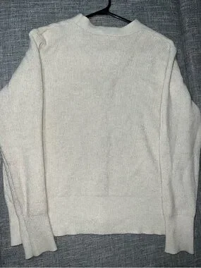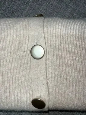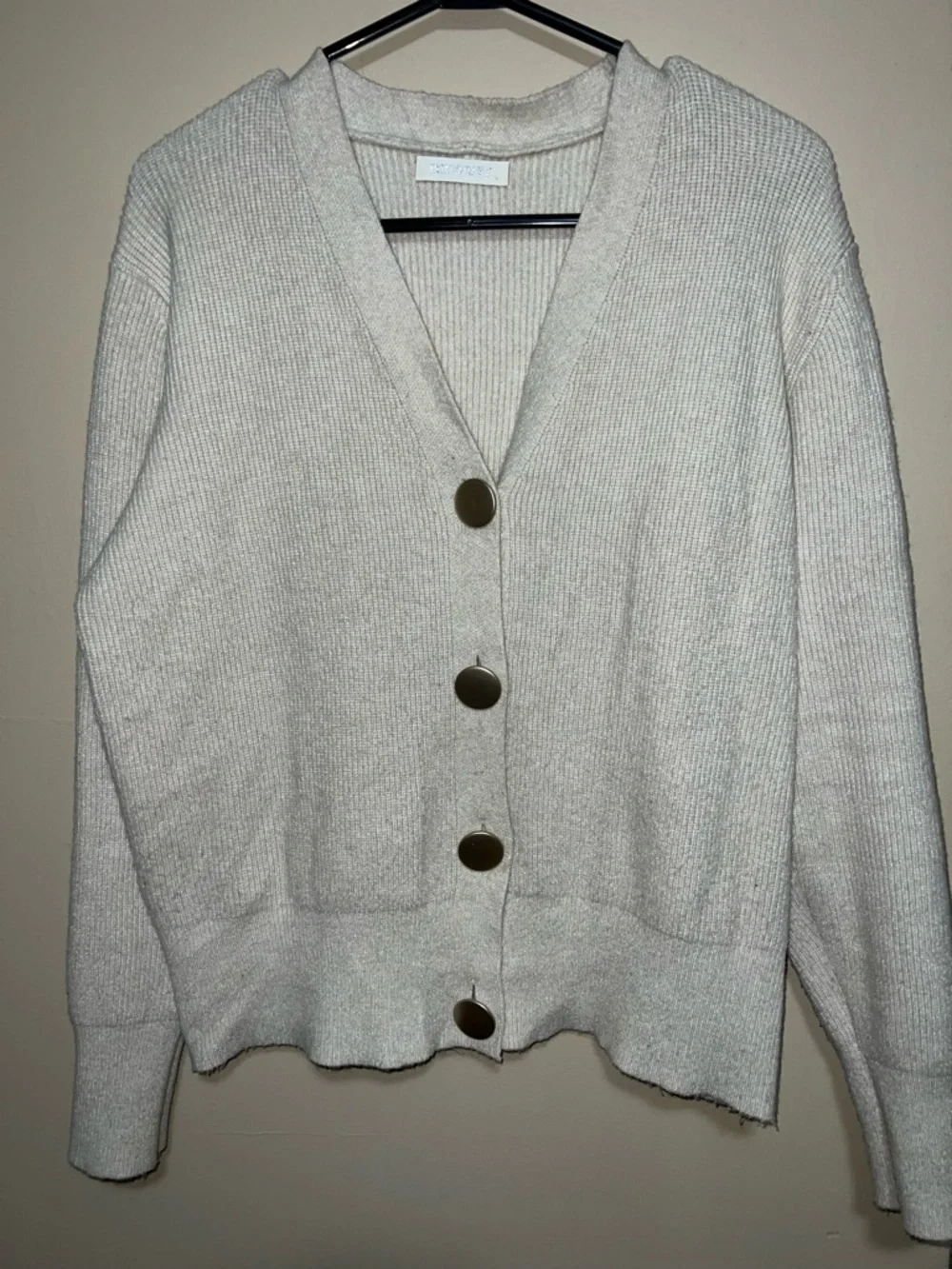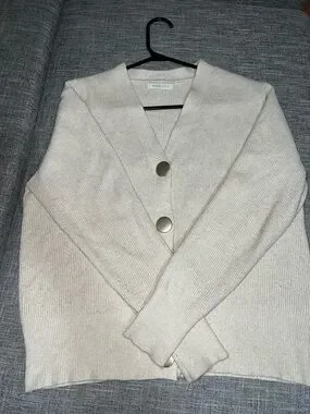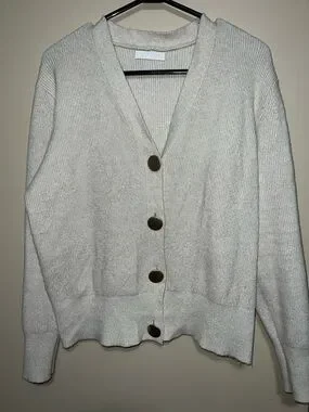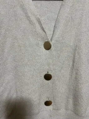 Soft cream ribbed cardigan with a V-neck and large round buttons. Lightweight knit offers comfortable stretch for everyday layering. Versatile cream color pairs easily with denim or tailored pieces for a polished yet relaxed look.