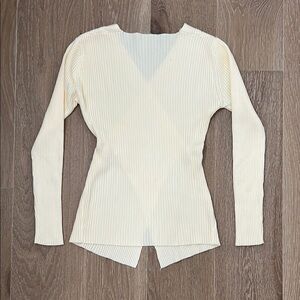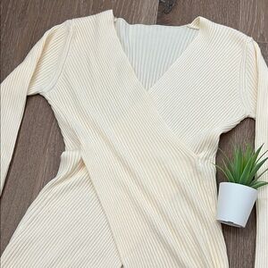 Stylish cream ribbed top with a deep V-neck and long sleeves. Perfect for any occasion.
