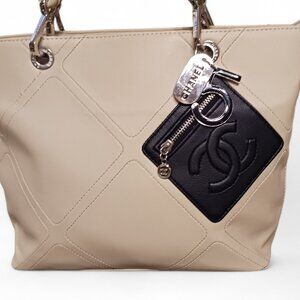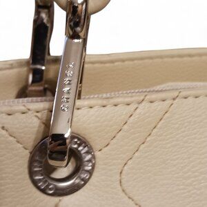 This elegant cream colored Faux vegan leather shoulder carry-all tote bag is perfect for everyday use or travel. It features a small, angled black zippered pocket on the front, adding a stylish and functional touch. Double padded handles and silver hardware, embossed with logos, add to its refined look. The top zippered entrance opens to a luxurious golden sateen-lined interior with two slip pockets and one zippered compartment for easy organization. Measuring 15" L x 10" H with a 10" strap drop, it’s the ideal size for carrying your essentials. In excellent condition, it appears unused, with only a couple of slight marks on the back from storage. Please see pictures. A chic and versatile addition to any wardrobe!