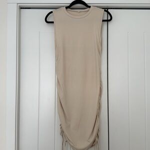 • Feature: Ribbed knit, sleeveless, casual crew neck, curved hem, above knee length, two sided ruched with adjustable drawstring creates rounded hem