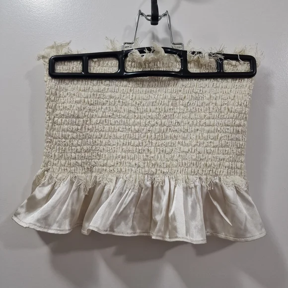 This cream crop top features a smocked bodice that offers a comfortable and stretchy fit, complemented by a playful ruffled hem. Its sleeveless design makes it perfect for warm weather or layering under jackets. The top's cropped length adds a trendy touch to any outfit.