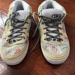 These cream sneakers offer a classic skateboarding style with a comfortable padded collar and tongue. The shoes feature a durable rubber outsole and a traditional lace-up design, making them perfect for everyday wear. they provide both style and functionality.