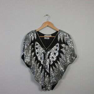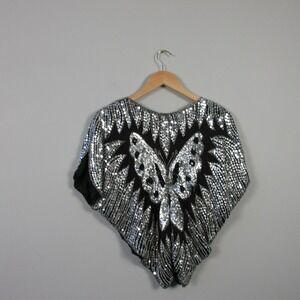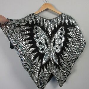 Keywords: Cream Soda, Sequin Top, Butterfly Top, Silk Top, Poncho Top, Cape Top, Sequin Poncho, Butterfly Cape, Vintage Top, Party Top, Evening Top, Statement Top, Embellished Top, Black Top, Silver Top, Fairycore Fairy glam beaded going out disco
