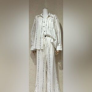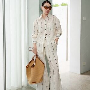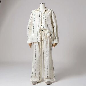 Elevate your style with this chic cream striped pants and jumpsuit set. Perfect for any occasion, this ensemble offers both comfort and elegance.