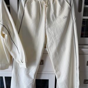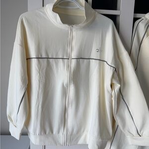 Stylish tracksuit set in cream. Includes a zip-up jacket and matching pants. Perfect for casual wear. Measurements in pictures.