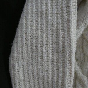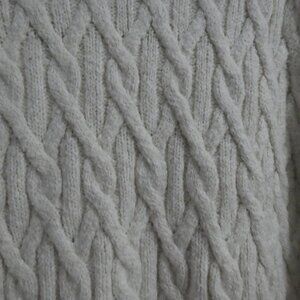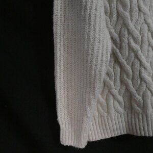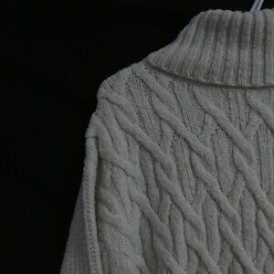 A stylish cream turtleneck sweater with an elegant cable knit pattern