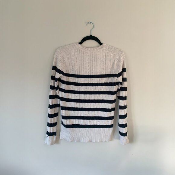 Cream White & Black Tommy Hilfiger Striped Long Sleeve V-Neck Sweater