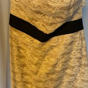 Black 'belt' cute in just the right place on this mini strapless Lacey cream coloured dress. Great for special occasions
