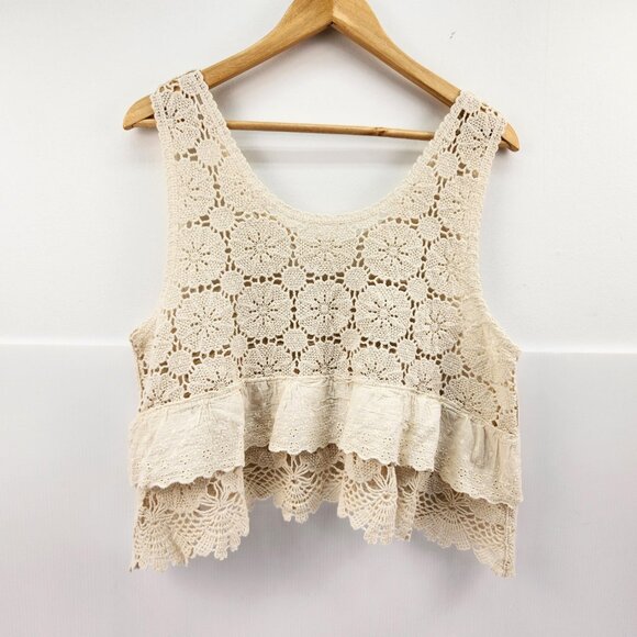 Cream crochet top with lace eyelet detail, size Medium, sleeveless retro handmad