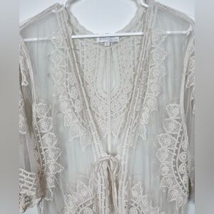 Rebellion Again brand lace embroidered cream pool beach coverup, midi length, front ties, wide short sleeves. Boho hippie chic, perfect for outdoor concerts, festival, vacation (photos make the robe look gray-ish, but it is cream, like last photo)
