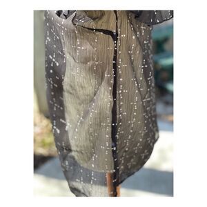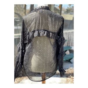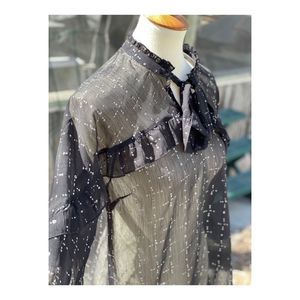 Cream Sheer Blouse Long Statement Sleeve Keyhole Bow Tiered Ruffle Neck Sz 38