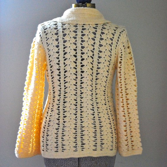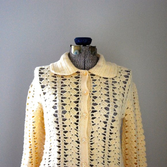 This vanilla coloured cardigan is made by hand in a beautiful crocheted lace pattern. It has nice collar and cuff detailing and is fastened with vintage buttons. A cardigan that would be a staple in a winter wardrobe and the lace detailing would really pop when paired with a black long sleeved shirt.