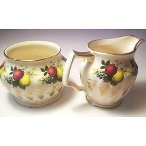 This Creamer Sugar Bowl Set with an Assorted Fruit Pattern by Sadler Eng is a vintage piece marked 3426.