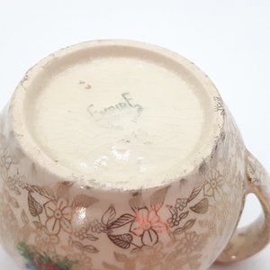 A nice little creamer made by Empire Porcelain in Staffordshire, England in the 1930s (judging by the marks). It features floral gold filigree throughout and has 2 scenes. The first is of multi colored flowers and a font while the other is of a woman in period dress walking amongst flowers; she is similar to the Lavender Lady and Duchess in other works. There are no cracks or chips but there is crazing. The creamer is 2 3/4" tall and 3" at its widest without the handle.