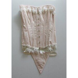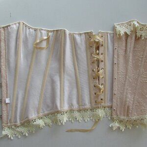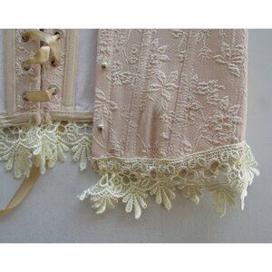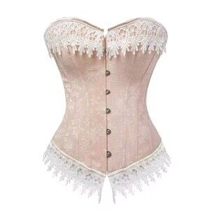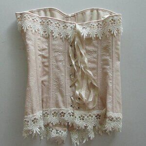 NOTE: The small size is the lighter fabric and lace version shown. All other sizes are the darker cream jacquard and lace corset shown. You can see the difference in the photo with both
