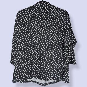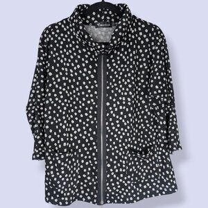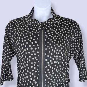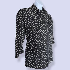 This sweater/top by Creation is made of a polyester/spandex blend (95/5) and is black with small white squares that are like polka dots. The sweater has a round neck with some excess fabric (rolled down in the pictures), 3/4 sleeves, and a bit of stretch in the fabric. There is a zipper running down the front of the top with the metal pull ending at the bottom, but the zipper doesn't actually open the front, it's just a decorative element. The fabric is somewhat lightweight, making this perfect for spring and summer weather. I'll be honest, I like this top because it's so strange and I think it has a lot of potential to be a really fun piece. There is some wear, but there are no issues affecting wearability.