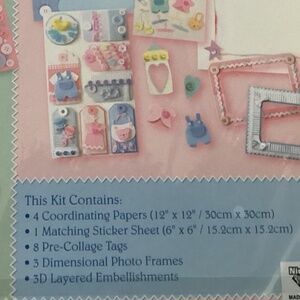 Includes 4 coordinating papers, 1 matching sticker sheet, 8 tags, 3D photo frames, 3D embellishments. Unopened package, never used.