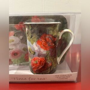 This lovely range of contemporary and ,traditional designs capture the very essence of English Style and form part of a unique collection of design-led housewares. Enjoy your favorite beverage with the floral mug set. Featuring vibrant red and green hues, this fine china mug comes with a matching scatter tray and coaster. Perfect for tea time.