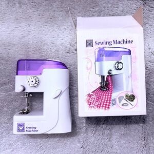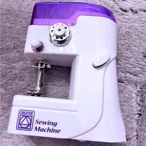 *Compact sewing machine in white and purple. Ideal for small projects.