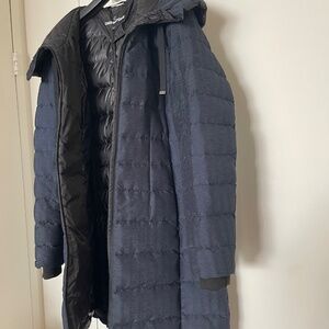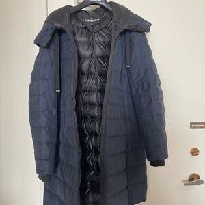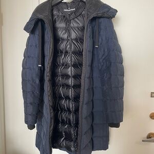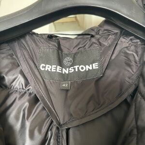 Sophisticated elegant design navy blue Creenstone coat for fall and winter. Size 42 which is a large. Filling- 90% duck down and 10% feathers. Lining 1 100% polyamide. Lining 2 100% polyester.