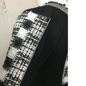 Stunning delicate Slav folk/ native style black/ white flowy, crepe half 3/4 sleeve, cropped blouse with sheer crochet embroidery.