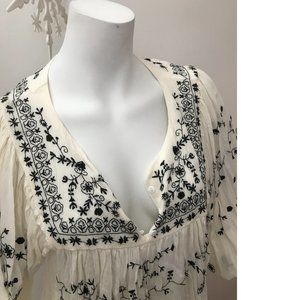 Stunning delicate Summer Slav folk style black/ tan flowy swing top, crinkle crepe, half sleeve, cropped blouse with floral embroidery.
