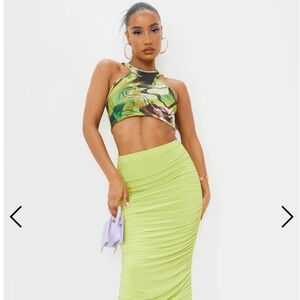 Get maxing out your wardrobe with this crop top doll. Featuring a lime hue abstract print crepe material with a racer neck and cropped fit, what's not to love? Finish off the look with a bold hue skirt and matching heels for a night with the dolls.