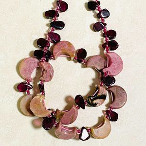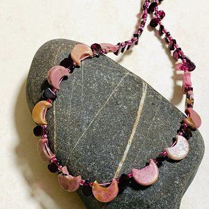 Crescent Moon Rhodonite Garnet Necklace, Beaded Genuine Gemstone