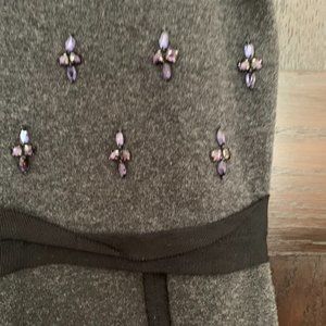 Lovely soft grey ponte dress with short sleeves and a fit-n-flare shape. Navy rhinestones applied in a compass style throughout the upper front portion. Grosgrain ribbon trim along the waistline and on the skirt to emphasize the cut of the dress.