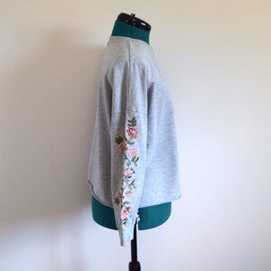 Crewneck Gray Sweater with Pink Embroidered Flower Sleeves