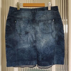 Super cute lace print denim mini skirt. Five pocket, double button and zipper front closure. Front has Ruffle vent with an under layer of lace print Ruffle edge denim. Vent in back and seam work on sides. the lace print fades in and out with a distressed look. Excellent Pre-owned Condition, no stains, rips etc. Not much wear at all. Detailing on belt loops, some are slanted at angles and some are doubled. Upper skirt is lined.