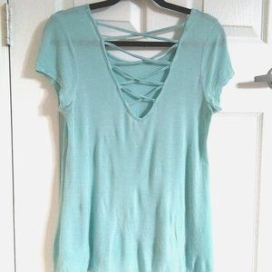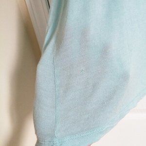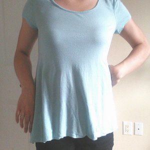 Soft fabric with some stretch. 95% viscose 5% spandex. Top length (front) 64 cm (back) 71 cm. Tiny mend bottom right. Looser fitting top that measures 44 cm across chest under arms laying flat.