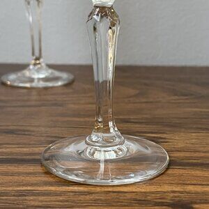 They have a tall, slender, and slightly tapered flute shape with a refined, faceted stem and a wide, stable base.
