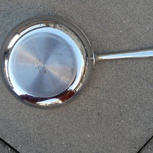 High-end cookware made in France: Cristel saucier from the Casteline collection. Features a riveted fixed handle, rolled lip for ease of pouring, and volume markings along the side. 5-ply construction, according to their website and suitable for gas, halogen, ceramic and induction.