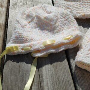 Adorable baby jacket and hat set in white, orange, and yellow.
