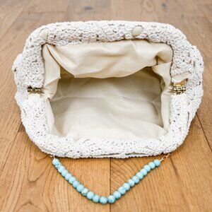 This beautiful crochet clutch has a strap featuring genuine stone beads. Height 6" x 11" Length x 4" Width