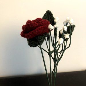 Handmade crochet flowers. The rose is a beautiful deep red, with white baby's breath. The perfect gift for Valentine's day <3