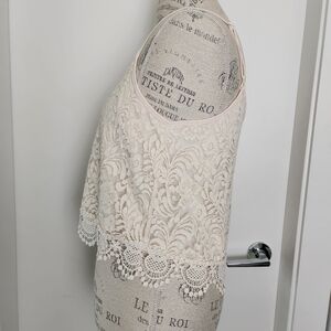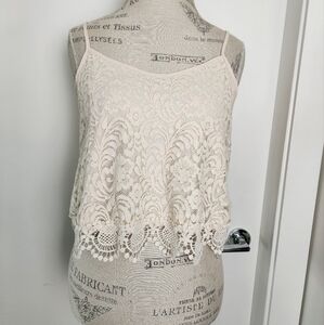 Cream Floral Crochet Lace slightly Cropped Sleeveless Camisole Tank Top with Scallop trim and adjustable spaghetti straps, by Charlotte Russe for Ambiance Apparel.