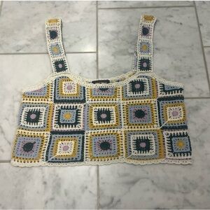 Chic crochet tank top featuring a vibrant patchwork design. Perfect for adding a pop of color to your wardrobe.