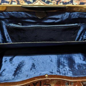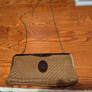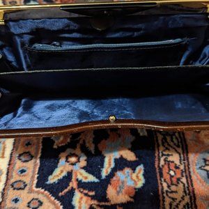 Brown crochet leather purse that can be used as a clutch or on shoulder with a gold chain attachment. Blue satin inner lining with 2 compartments, 1 inner zipper pocket. Snap button closure and can expand to carry a few items. Size is 11" W X 6 "L X 2" D.