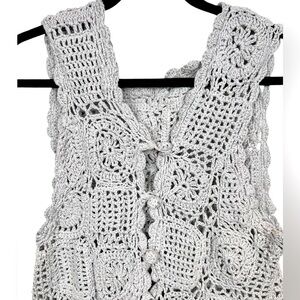 Beautiful crocheted gray cotton long vest, with matching bobble buttons, granny square pattern, Handmade! Measures like a Small, check measurements. Excellent preowned condition