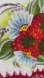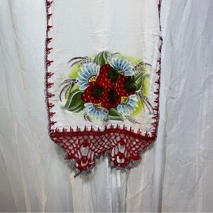 Like new tablecloth, accent with crochet stitching and knitting all around the edges and a handpainted image on the front comes to a triangular point, and one side, and the other side is squared