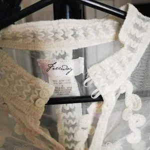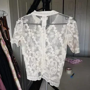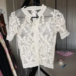 Crochet Lace blouse with two buttons at top and cute short sleeves.