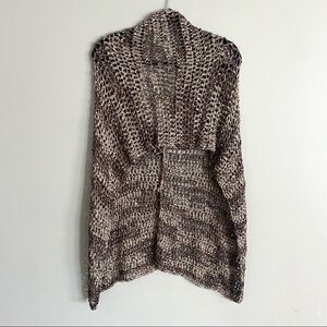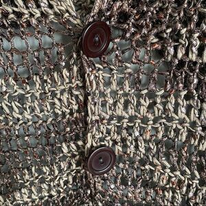 Picturing a brown crochet polyester shawl with 2 button closure in one size. very versatile and has great seasonality.