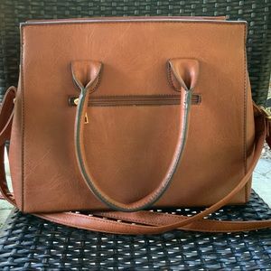 This handbag is in immaculate condition. It was purchased in Italy. There is no brand or materials label in the interior of the bag. I was told this often the way bags are in the Italian market. The interior is divided into two sections by a large zippered compartment. There are also two good sized pouch pockets and a fairly large zippered compartment on one side. The interior has no staining and is very clean. The hardware and zippers are in excellent condition. The handles and crossbody strap are also in great condition.