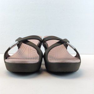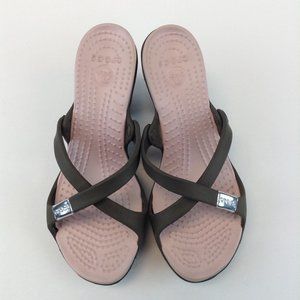 Crocs Cyprus Brown Pink Criss Cross Strap Block Heels Slip On Shoes.