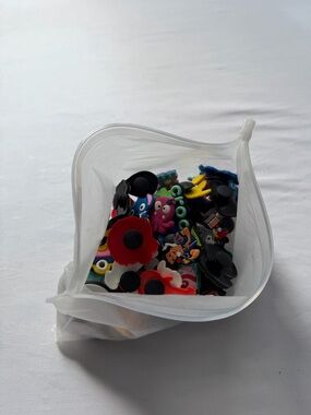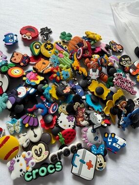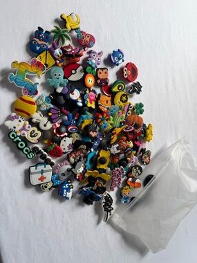 Bag of jibbits, some are the expensive “croc” brand and some are cheaper jibbits. Some are also without the back piece, they did not fall off, they came that way as extras! Only a few have been used so they are pretty much all in perfect condition!